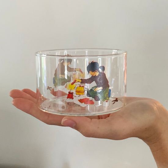 Die Glühweinschalen aus Glas von Storefactory sind mit je einer farbigen Illustration aus dem Buch "Die Kinder aus Bullerbü" bedruckt.