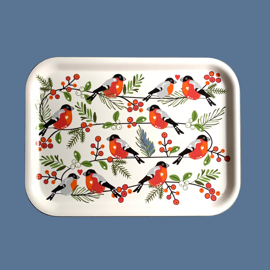 Herrlich, wenn die kleinen Dompfaffen im verschneiten Park herumhüpfen oder Futter aus einem Futterhäuschen naschen? Hole dir deinen eigenen kleinen Schwarm Dompfaffen mit diesem rechteckigen Tablett aus Holz für skandinavisches Weihnachtsgefühl nach Hause. In Schweden sind die Dompfaffen (auch Gimpel genannt) ein beliebtes Weihnachtsmotiv.