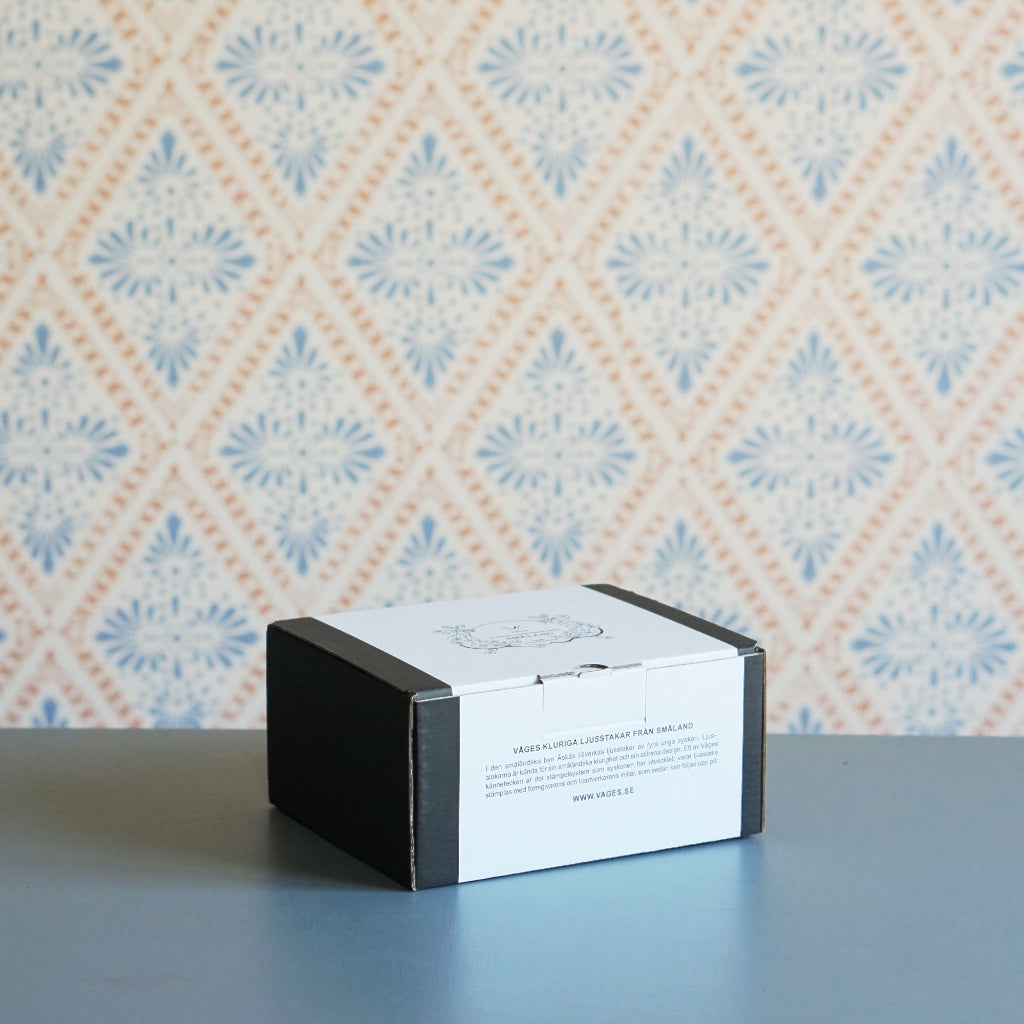 Ein wirklich pfiffiger Kerzenhalter aus Metall, der von Våge selbst entworfen wurde. Aus diesem Grund ist auch das Design der Verpackung immer noch so, wie aus der Zeit der Entstehung des Kerzenhalters.