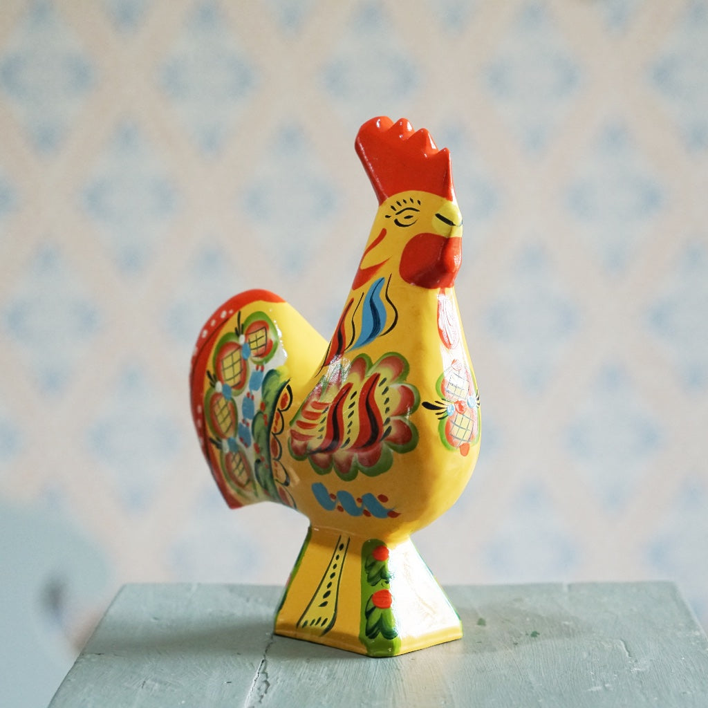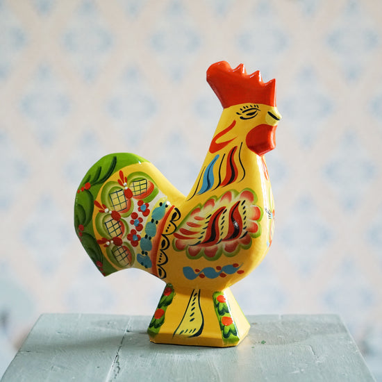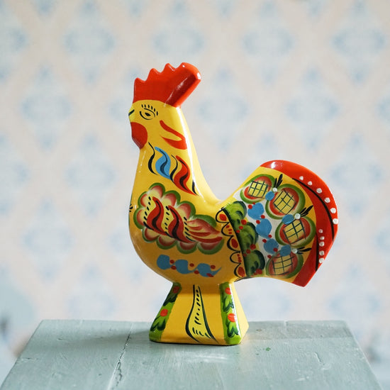Auch der Dalatupp, der Hahn aus Dalarna, ist mit diesem typischen Blumenmuster bemalt. Der Hahn ist ein uraltes Symbol für Wachsamkeit. In der Fabrik von Nils Olsson gehört er von Anbeginn zum Repertoire.