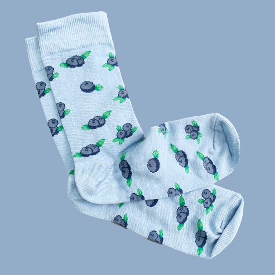 In der Pappbox gibt es Socken mit Blaubeeren, Walderdbeeren und Preiselbeeren - Beeren, die im schwedischen Wald in Massen oder auch an geheimen Stellen zu finden sind!