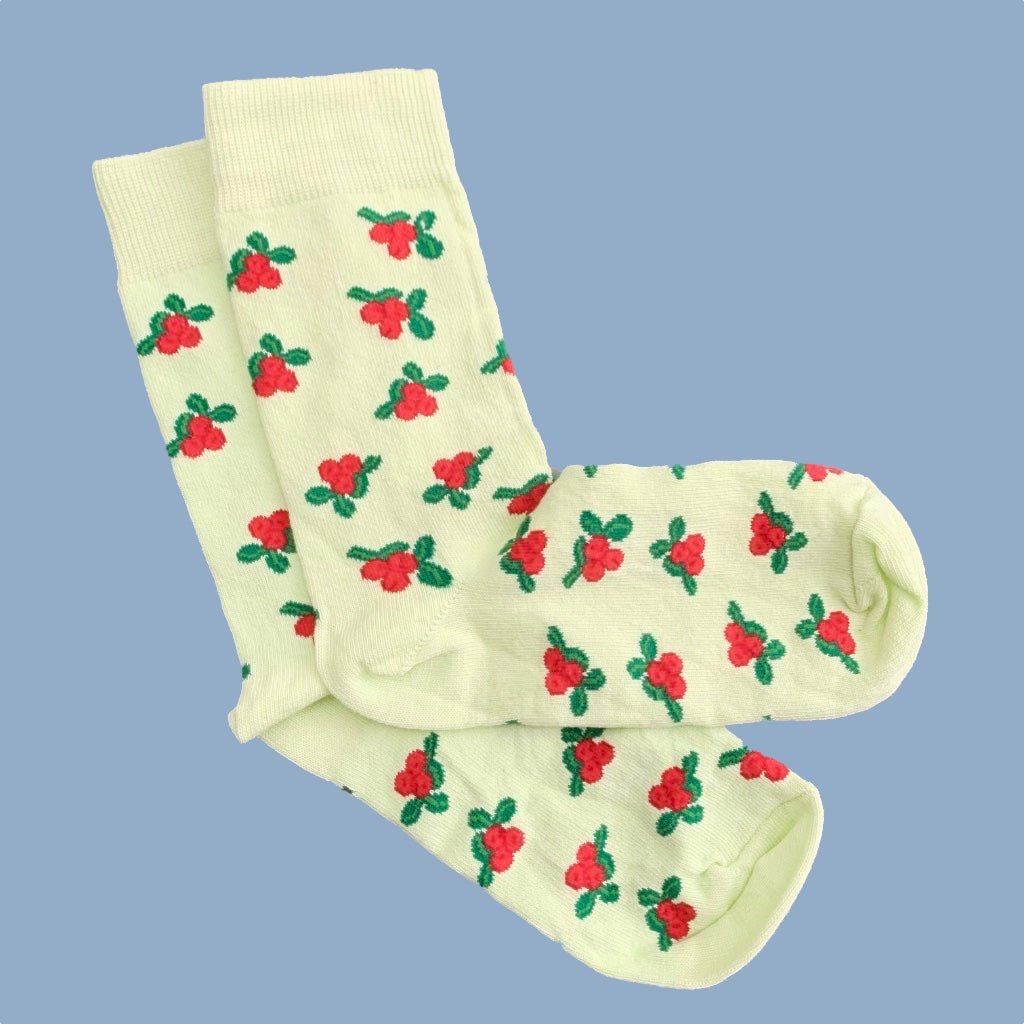 - Typisch Schwedisch: Socken mit Motiven von typisch schwedischen Süßigkeiten, Lebensmitteln, Blumen oder Früchten