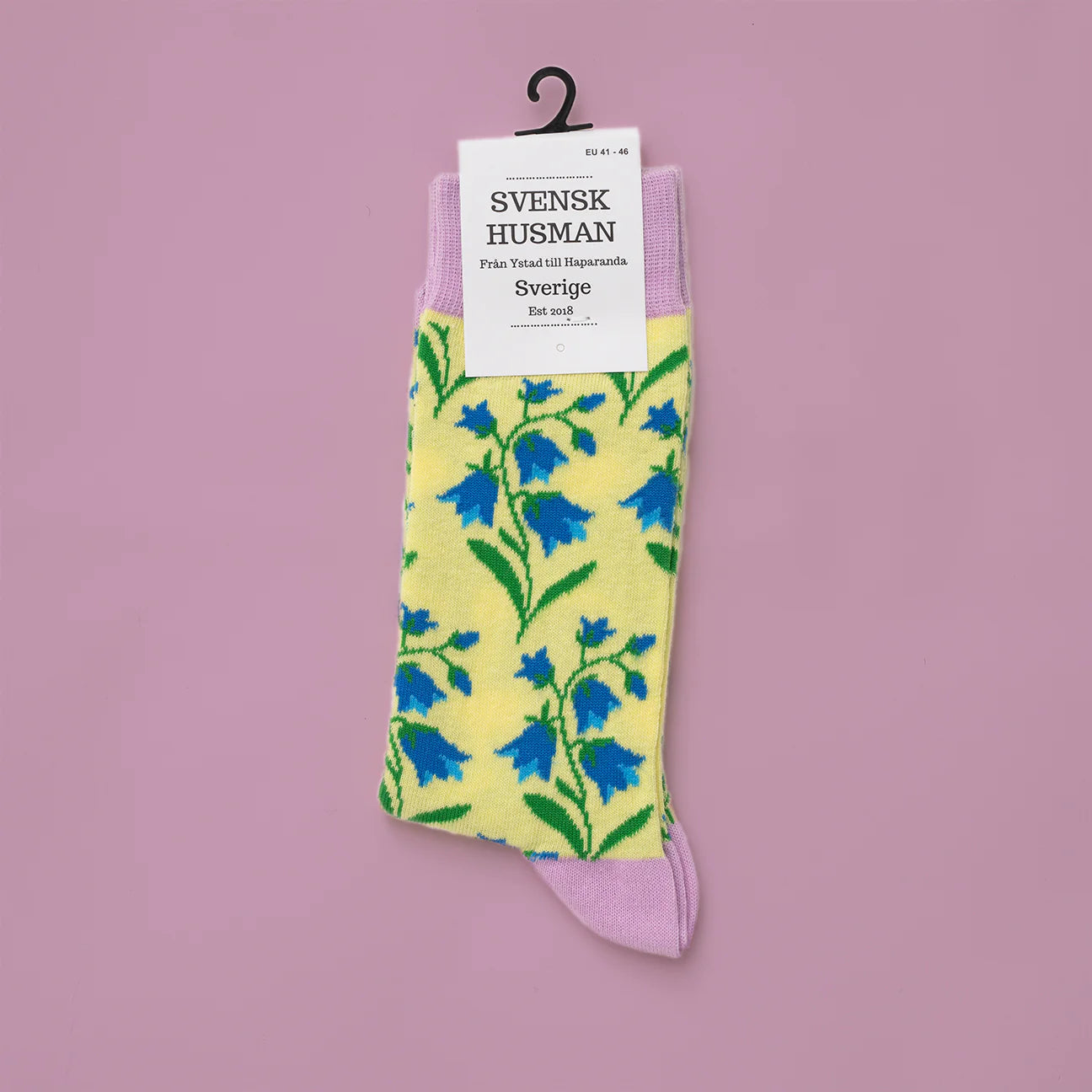 Erlebe unsere Blåklocka-Socken! Inspiriert von der Schönheit der schwedischen Natur sind diese Socken zart mit Glockenblumen verziert, die für etwas Sommer Charme sorgen.